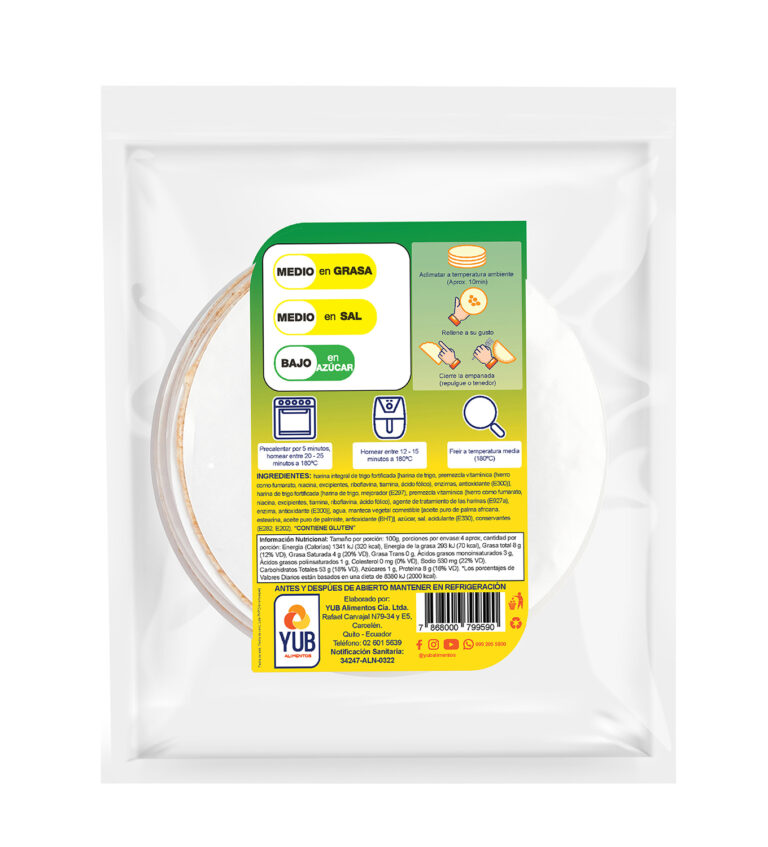 Su alto contenido en fibra nos ayuda a tener una dieta equilibrada. Quedan muy bien fritas y si las prefieres al horno debes tener cuidado con el tiempo de cocción ya que la fibra absorbe la humedad y te pueden quedar duras. Su presentación es de 12 unidades por paquete y su diámetro es de 14.5cm, un tamaño ideal para rellenar a tu gusto. Recomendamos un relleno que tenga una humedad moderada.